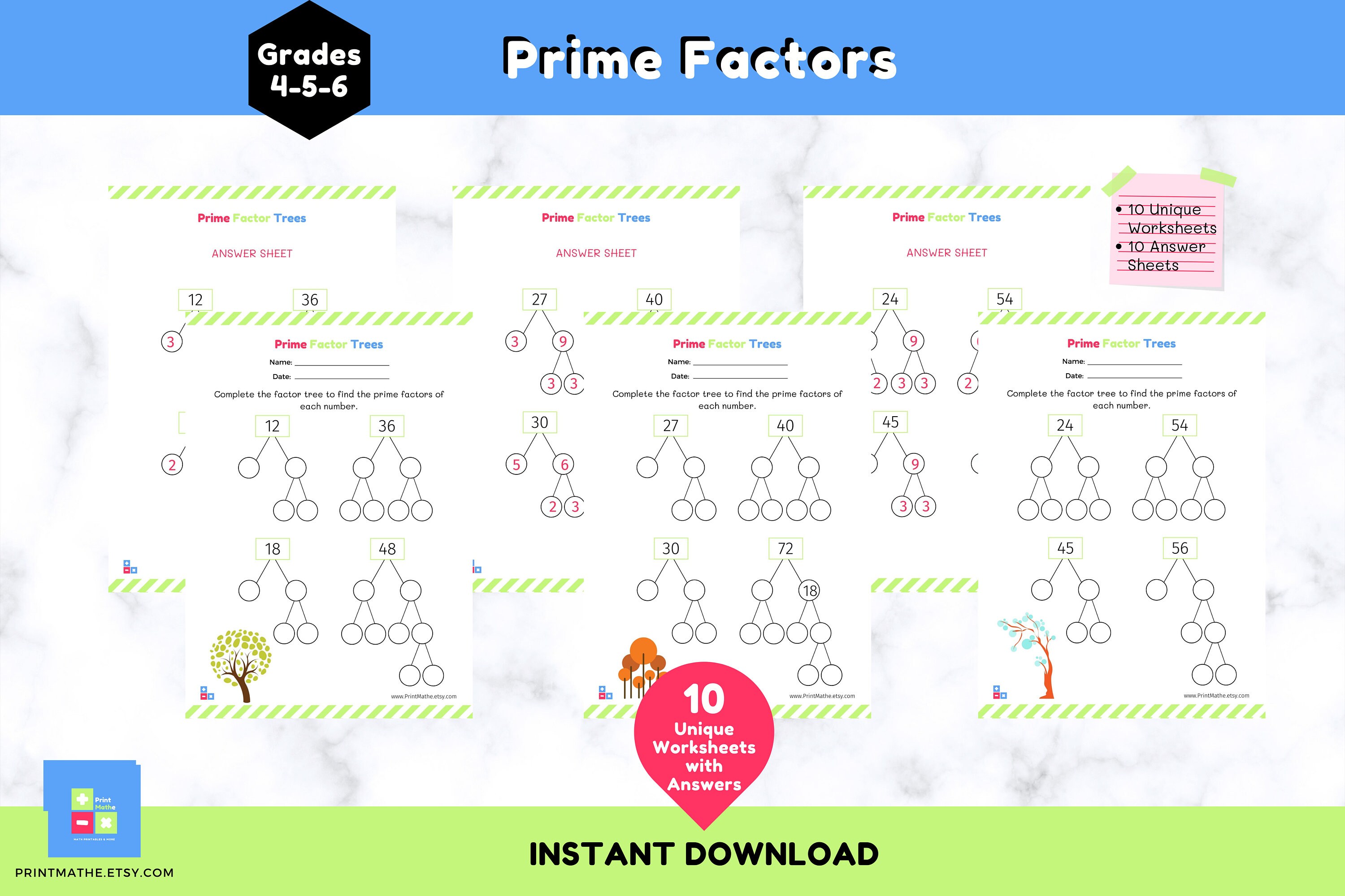 Grade 5 Factoring Worksheets: Prime factors (numbers under 500) | K5 ... Below are six versions of our grade 5 math worksheet on prime factors. Students must determine the set of prime numbers which multiply together to give the original number. A prime number can only be divided evenly only by 1 and itself. These worksheets are pdf files. Worksheet #1 Worksheet #2 Worksheet #3 Worksheet #4 Worksheet #5 Worksheet #6